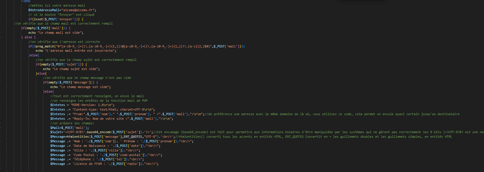 Code, montrant les commentaires de chaque explications pour Contact.